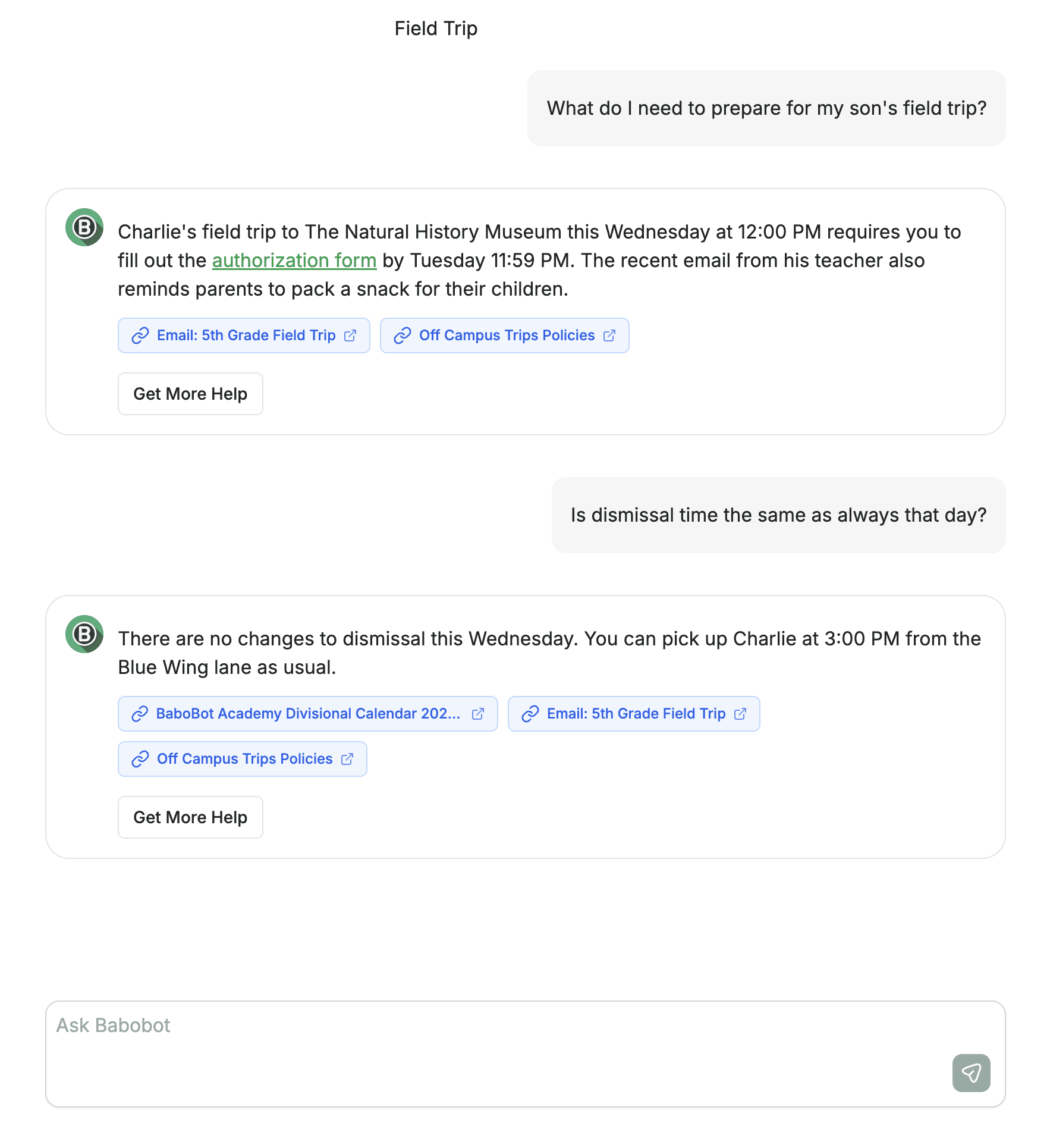 BaboBot answers questions using only verified information from your school's approved resources. Every response includes source citations, so users can see exactly where answers come from.